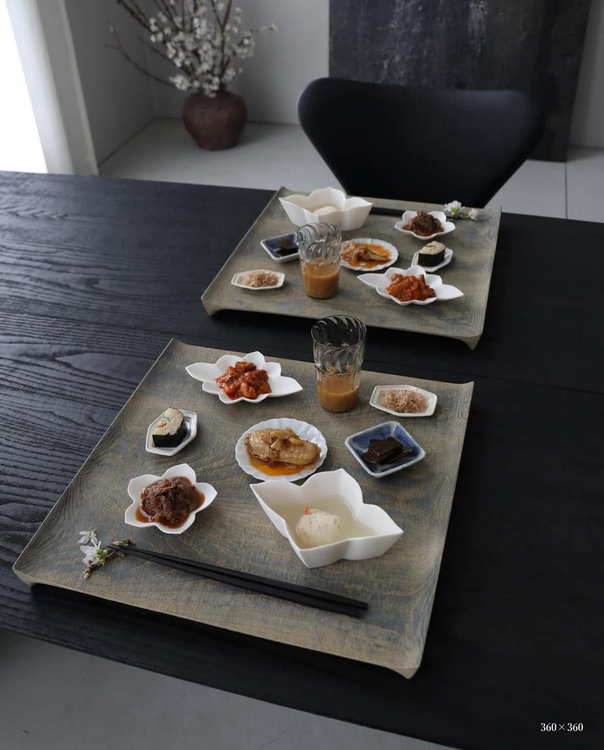 幸(さち)と書いて“さき”と名付けました。四季折々の恵みを穏やかに受けとめ、食卓に心地よい余白をつくるための折敷です。木の表情を生かした浮様が、季節の小さな器や湯気立つご飯をそっと引き立て、日々の食事を一つの風景として整えてくれます。
