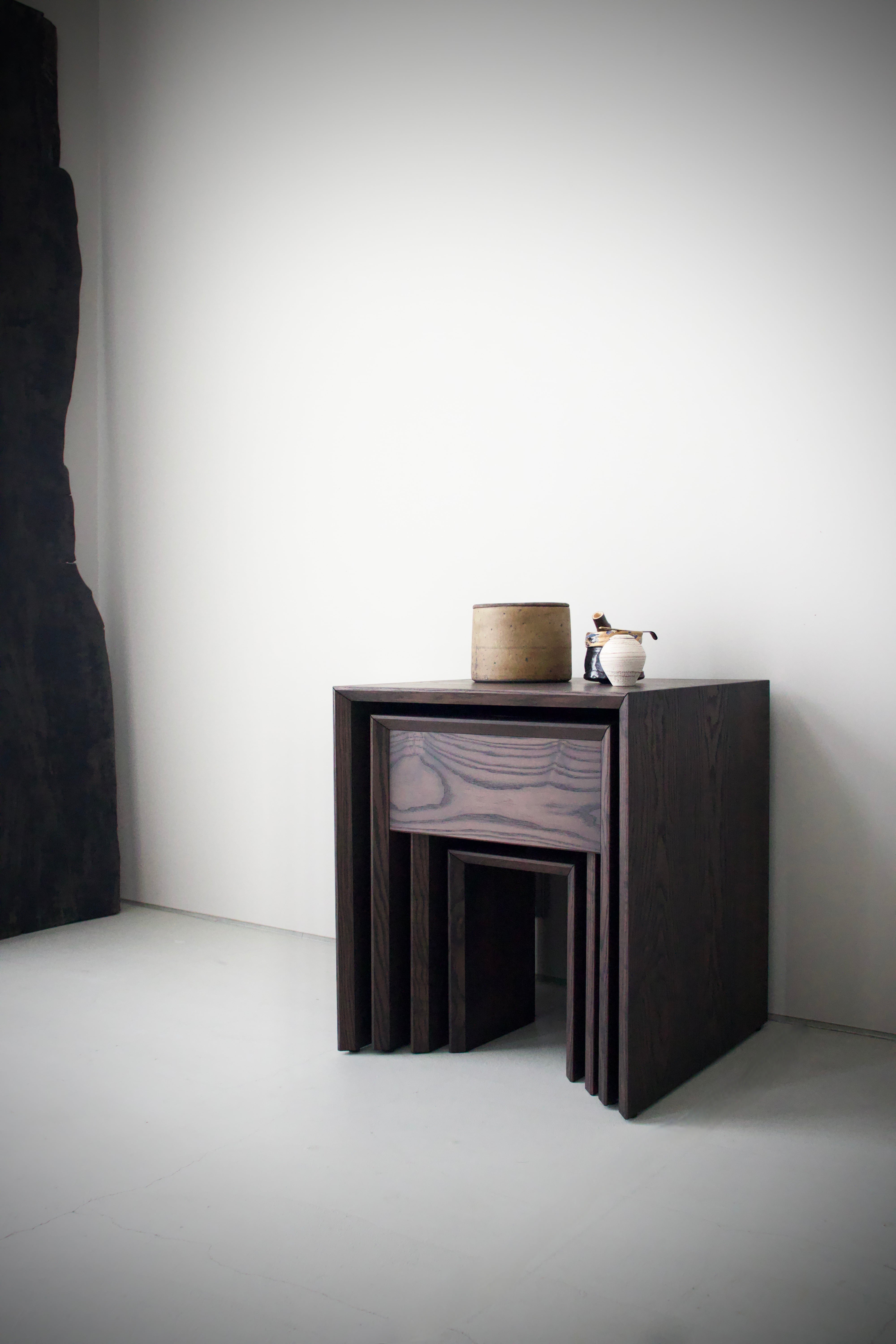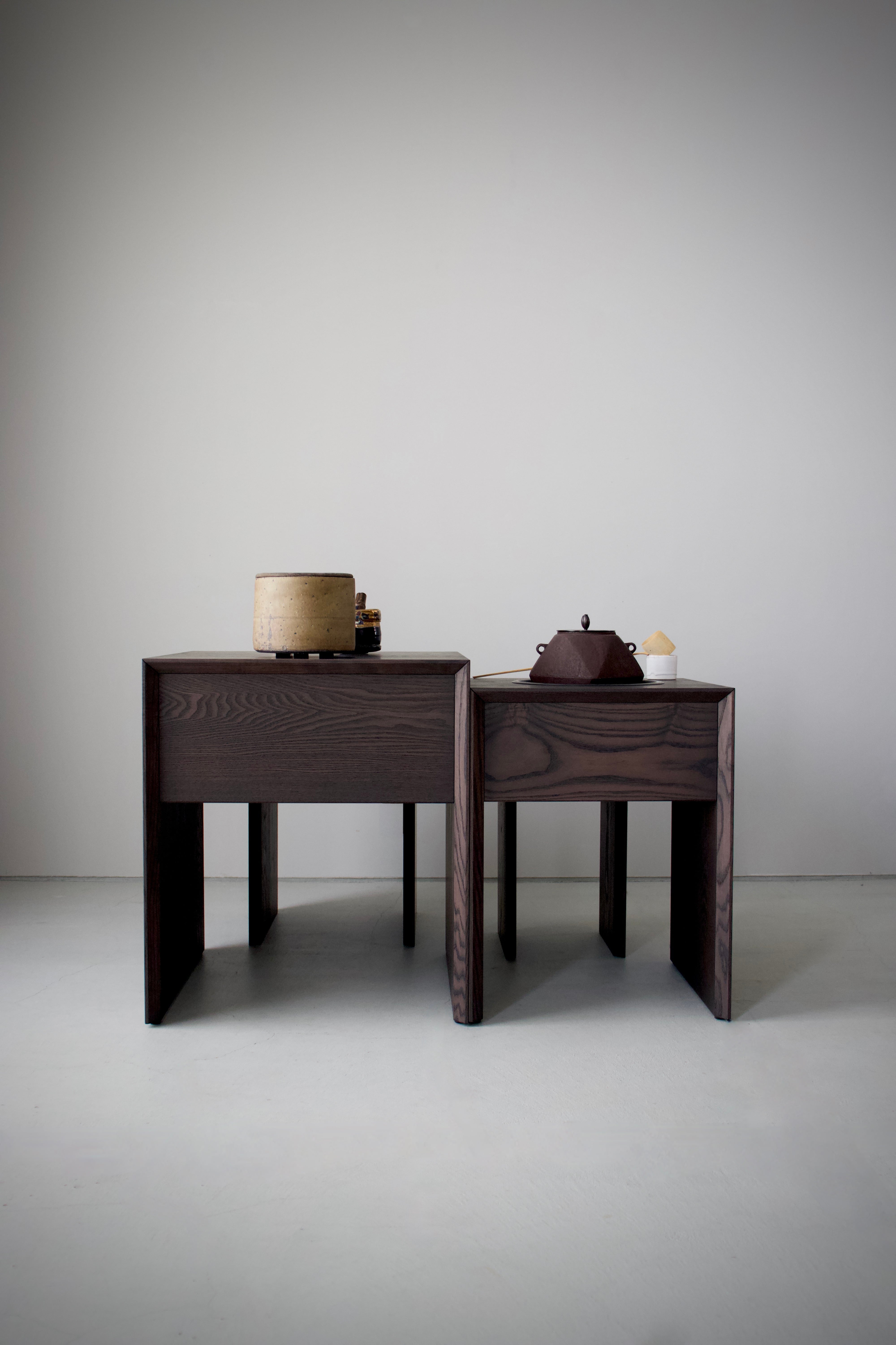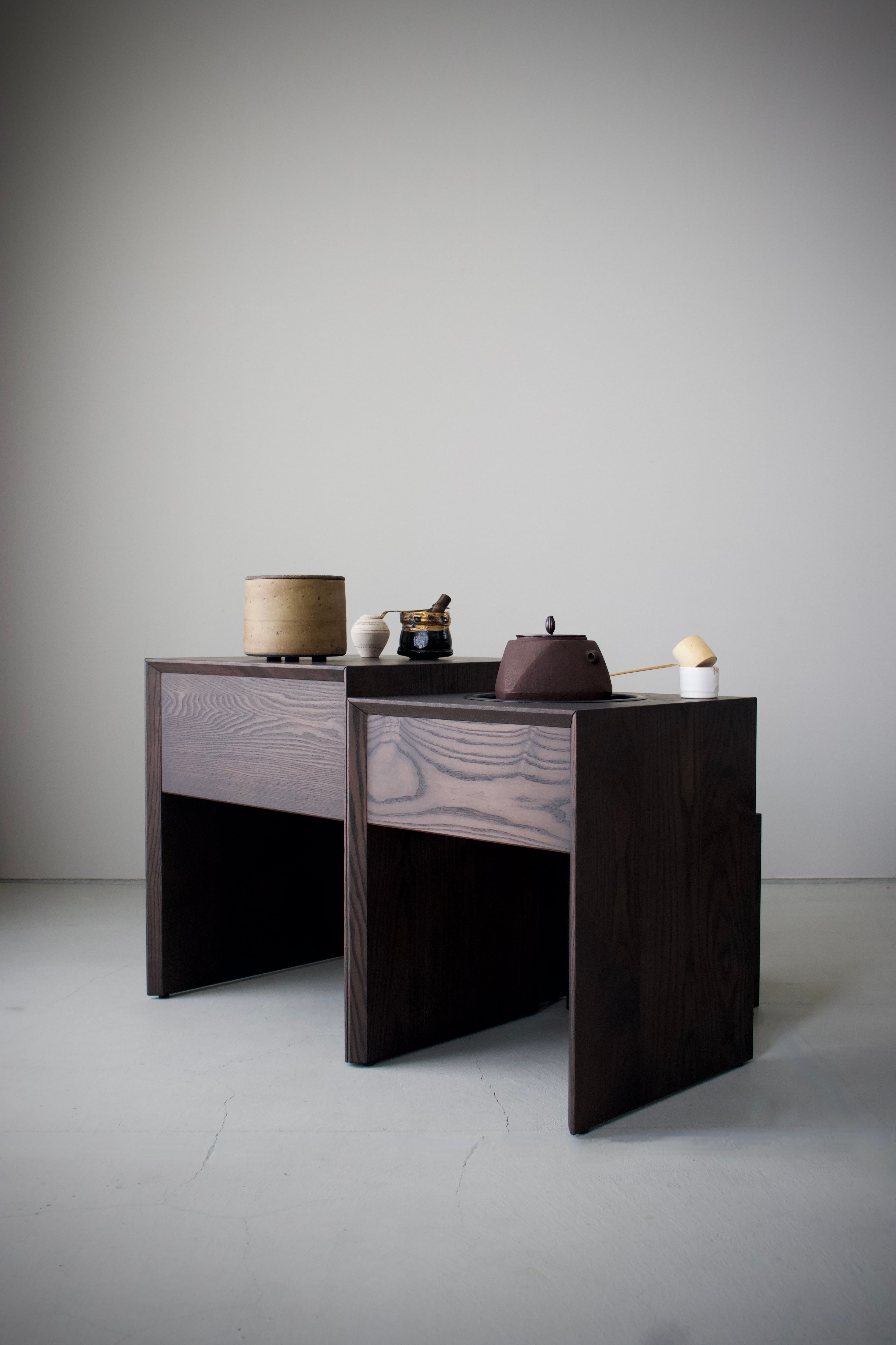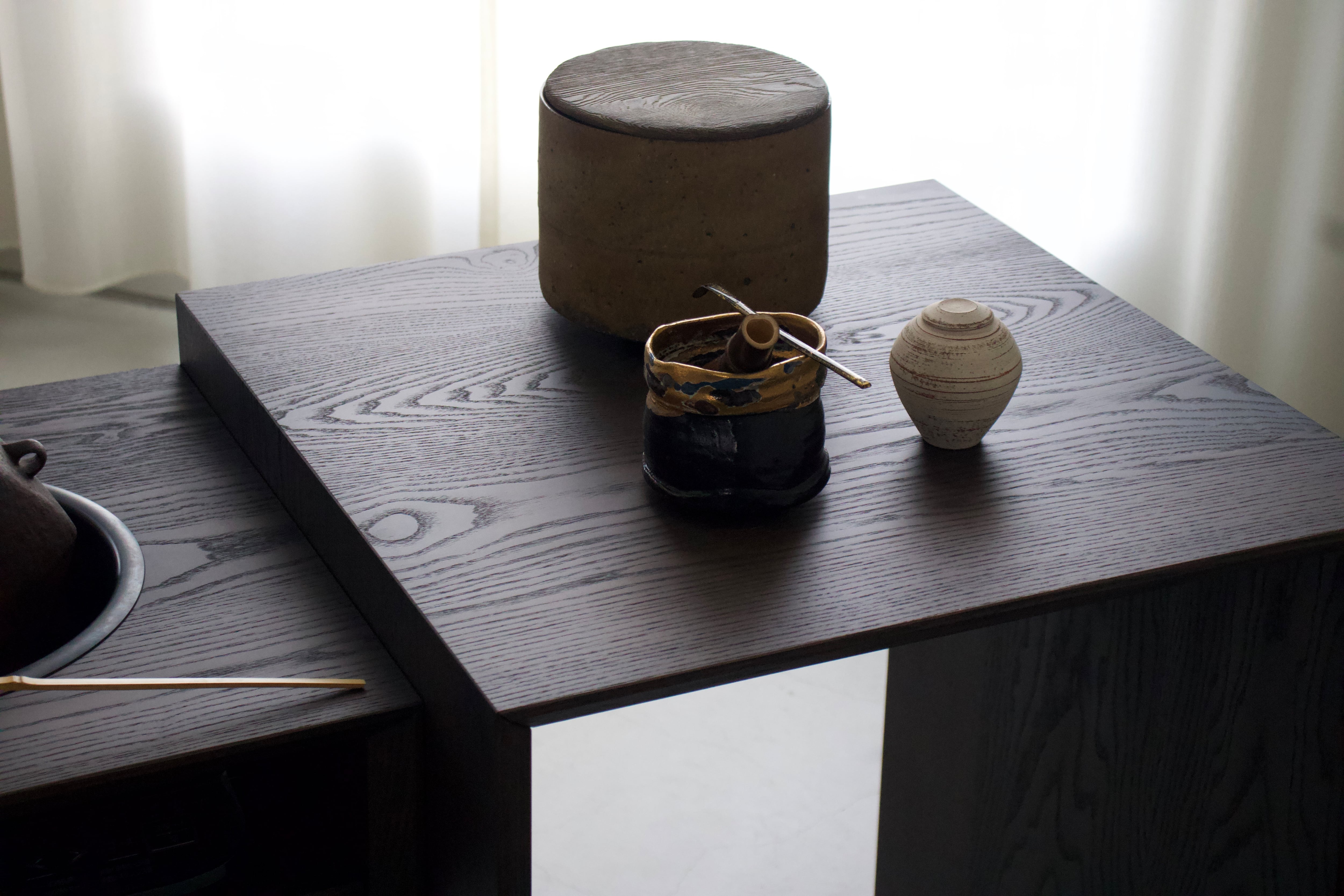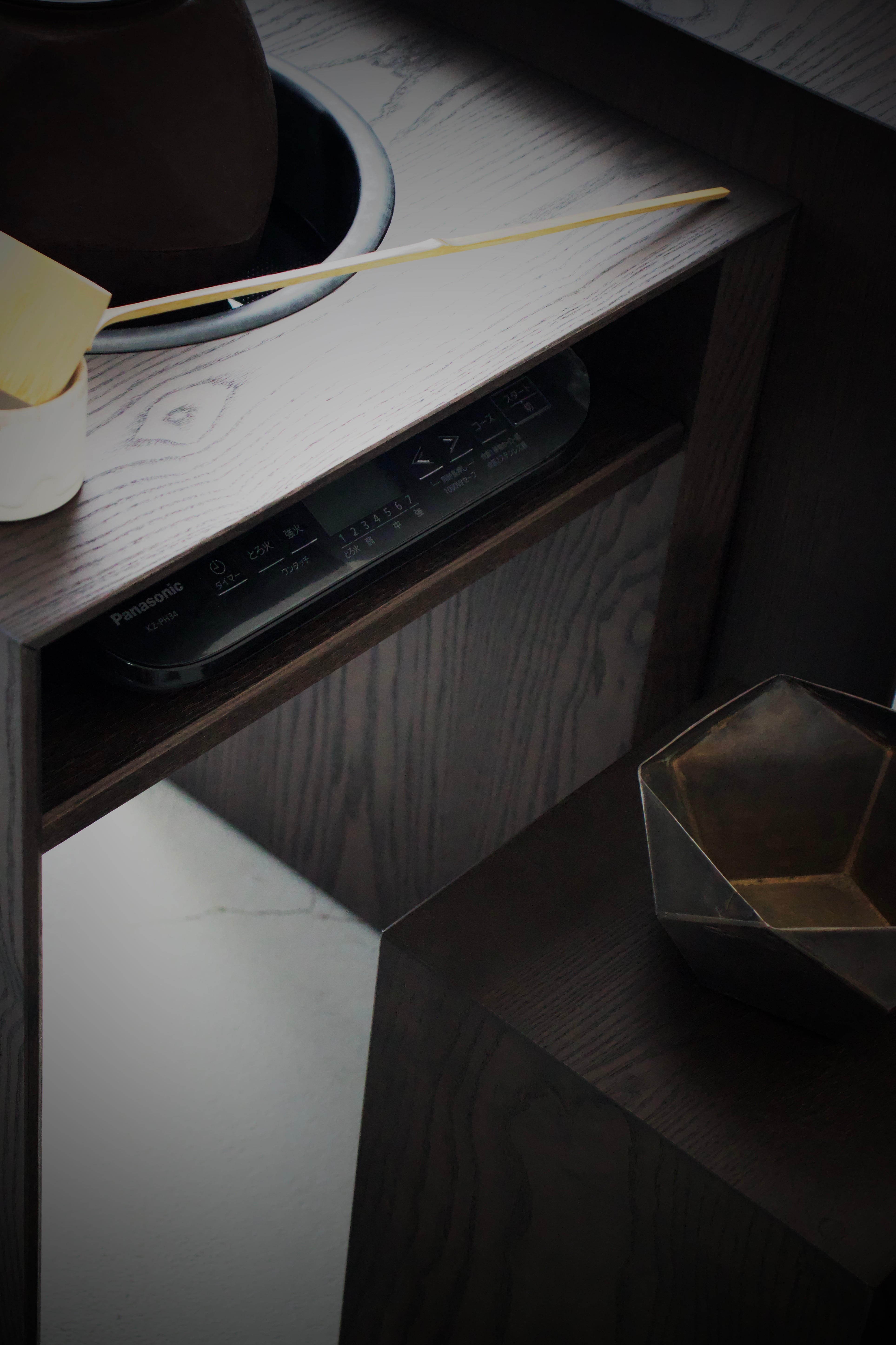 立礼卓(立礼式)は明治5年(1872年)の博覧会に際して外国人を迎えるための創案であり、幕末から明治の変動の時代に合わせた茶道の近代化の先駆として評価されています。その立礼卓を現代の生活空間に違和感なく、インテリアとして飾って頂けるようにデザインしたのがshimooの立礼卓です。流儀や形式などの決まり事はない為、どなたでもお茶を愉しんで頂ける家具になっております。また、入れ子式になっておりますので使用しない時はコンパクトに収納することができます。本格的に茶道をされている方はもちろんですが、気軽にお茶をはじめたい方、お友達やお客様をおもてなししたい方などにはおすすめの一品です。本商品はIH仕様となっておりますので安心安全にご使用して頂けます。